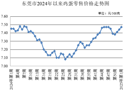 本周雞蛋農(nóng)貿(mào)市場(chǎng)平均零售價(jià)格每500克7.47元,較上周上升0.54%。