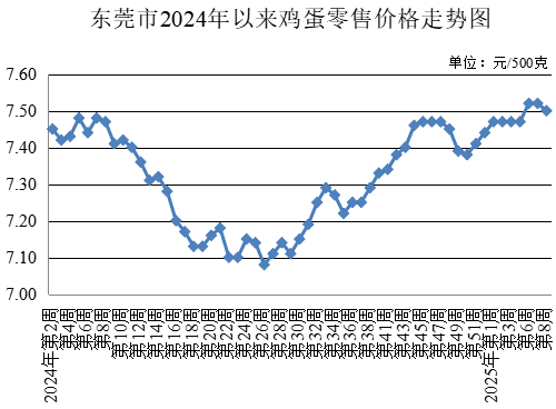 第8周,所監(jiān)測的雞蛋農(nóng)貿(mào)市場零售均價(jià)為每500克7.50元,較上周下降0.27%。