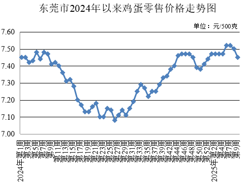 第9周,所監(jiān)測(cè)的雞蛋農(nóng)貿(mào)市場(chǎng)零售均價(jià)為每500克7.45元,較上周下降0.67%。